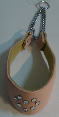 Näyttävä puolikuristava pehmeä nappanahkapanta,jossa kuristava osa 1,6 mm hitsatulla ketjulla.Koristeltu lasitimanteilla.