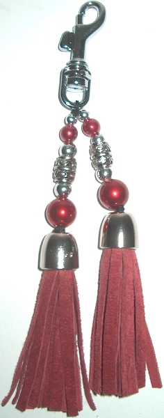 Punaiset nahkaiset tupsut pienellä pistoolilukolla. Helppo kiinnittää pantaan, taluttimeen, kassiin...